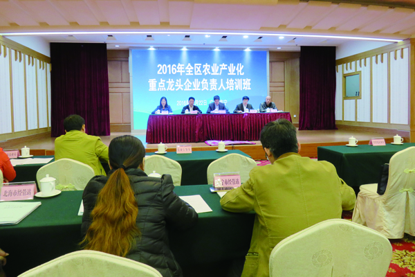2016年度全區(qū)農(nóng)業(yè)產(chǎn)業(yè)化重點龍頭企業(yè)培訓班于12月22日在南寧舉辦,正五海產(chǎn)與廣西中糧、常樂蠶絲、利添科技等8家北海本土企業(yè)與全區(qū)其他市農(nóng)業(yè)局(農(nóng)委)分管領導、農(nóng)業(yè)產(chǎn)業(yè)化辦公室負責人以及自治區(qū)農(nóng)業(yè)產(chǎn)業(yè)化重點龍頭企業(yè)代表共130多人參加培訓。旨在認真貫徹落實自治區(qū)黨委、政府的決策部署,交流學習龍頭企業(yè)在參與示范區(qū)創(chuàng)建、產(chǎn)業(yè)扶貧、企業(yè)創(chuàng)新管理以及文化建設等方面的主要經(jīng)驗和做法,