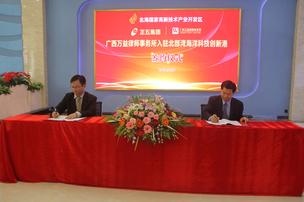 3月28日上午,在北部灣海洋科技創(chuàng)新港招商中心,舉行廣西萬益律師事務所入駐北部灣海洋科技創(chuàng)新港的簽約儀式。廣西正五集團董事長黃禮雄、副總裁榮培彥,廣西萬益律師事務所主任王瑩文、所管委會主任凌斌、執(zhí)行主任張海波等出席簽約儀式。