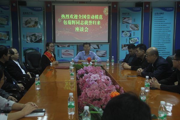 1127上午,正五集團公司熱烈歡迎全國勞動模范包菊輝同志載譽歸來。集團公司董事長黃禮雄帶領集團總經辦成員及各公司負責人、部門經理在正五海產公司廣場熱烈歡迎。